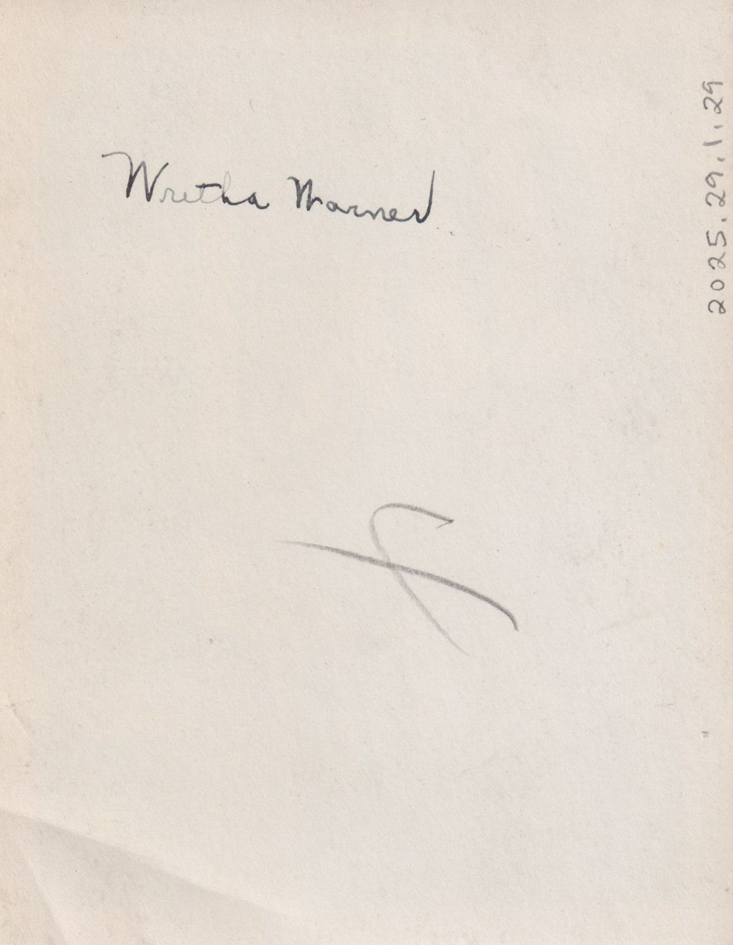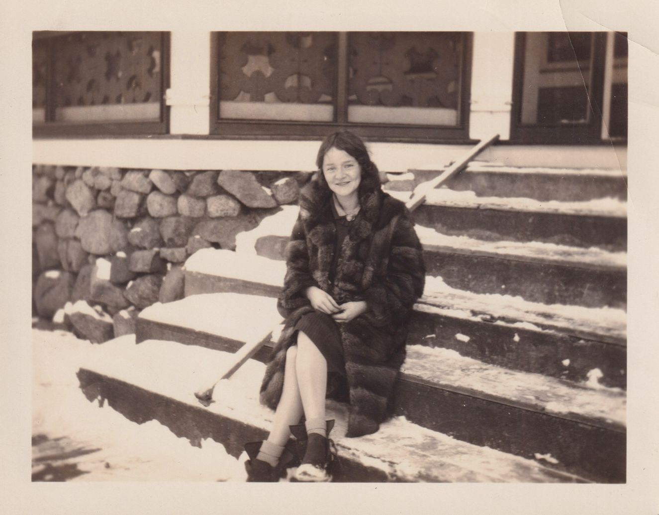 Black-and-White photograph of a young woman in a fur coat sitting on the stairs of a cottage. There is snow on the ground around her. "Wretha Warren" is handwritten on the back of the photograph.