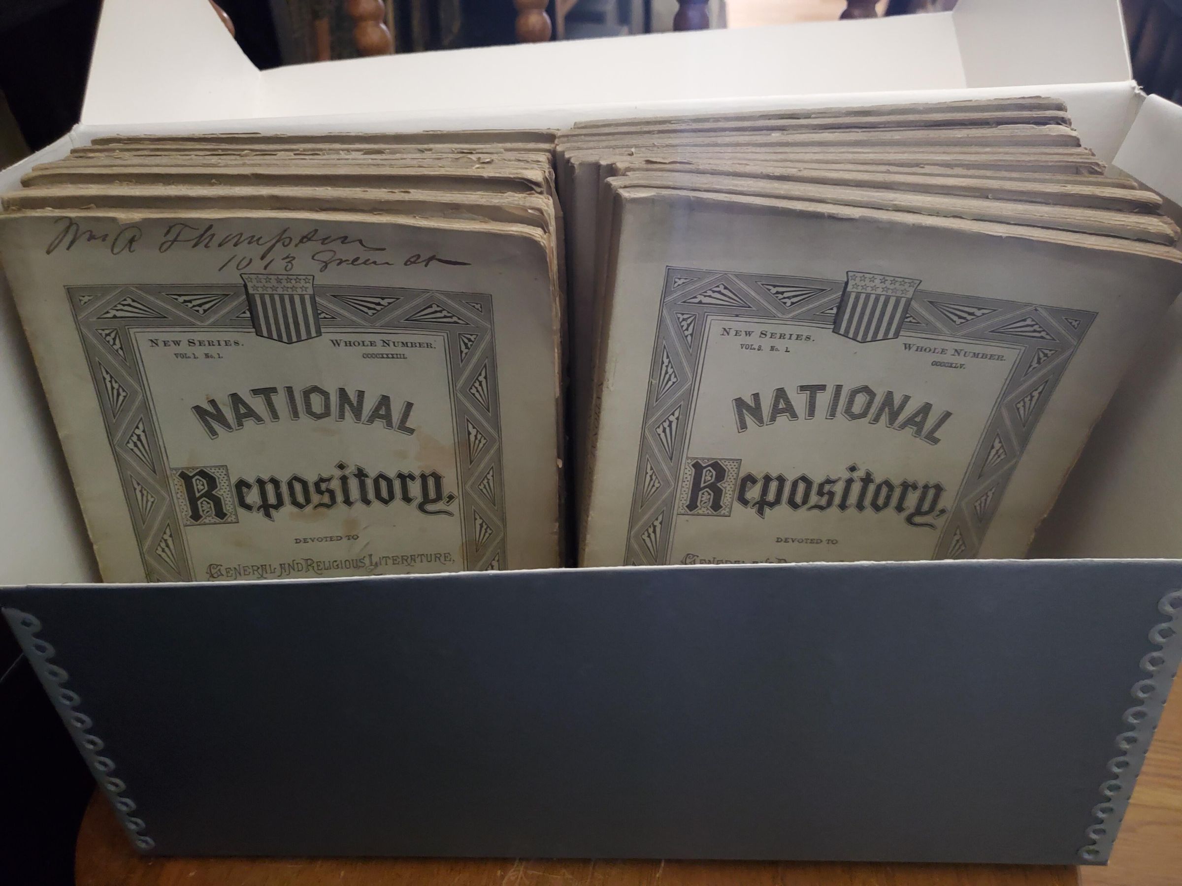 Bound magazines published 1877-1878. The National Repository magazine published by Hitchcock & Walden of Cincinnati. Magazine devoted to general and religious literature, biographies and travel, criticisms and art.Collection