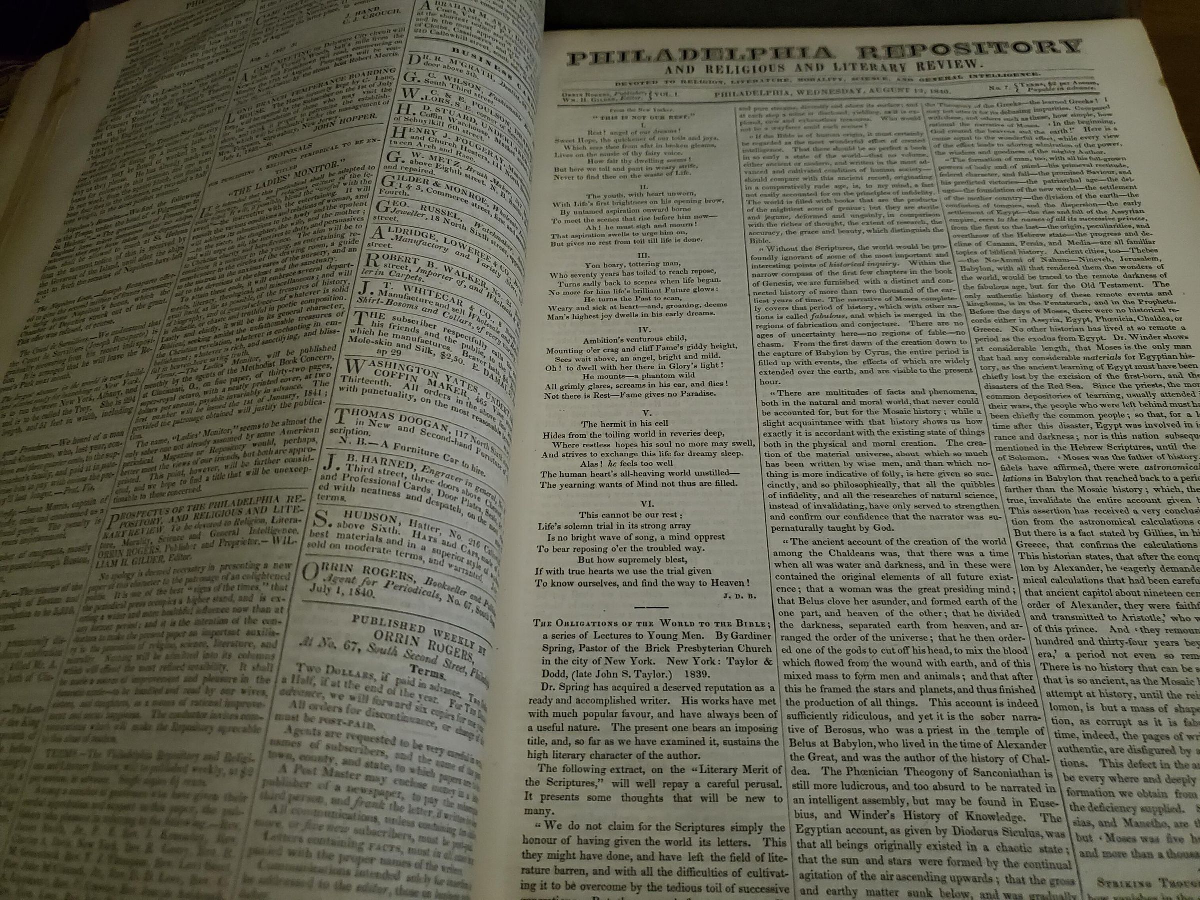 Bound magazines published 1840-1842. The Philadelphia Repository magazine published by Orrin Rogers and edited by William H. Gilder.Collection
