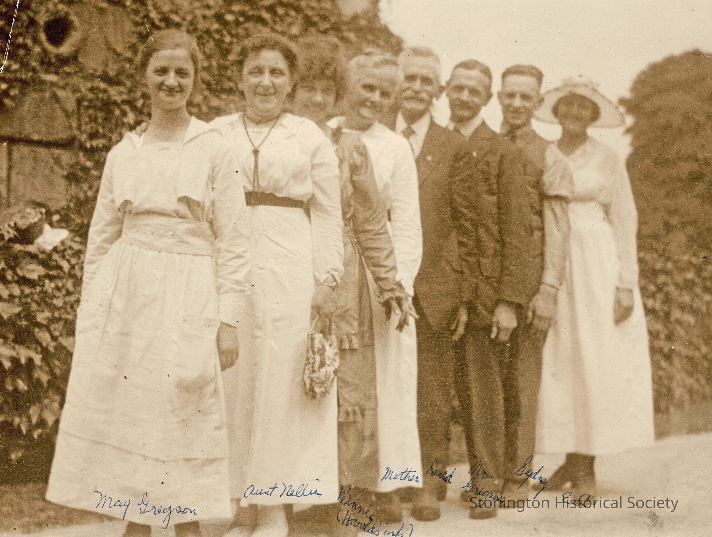A photograph of some members of the Crowther family and their friends or relatives, around 1915. Pictured are: May Gregson, Aunt Nellie (Ellen Crowther, Robert Crowther's half sister), Winnie, Mother (Alice Annie Ratcliffe Crowther), Dad (Robert Crowther), Mr. Gregson, Sydney, EC (Euphenia "Effie" Crowther Meeker).Collection