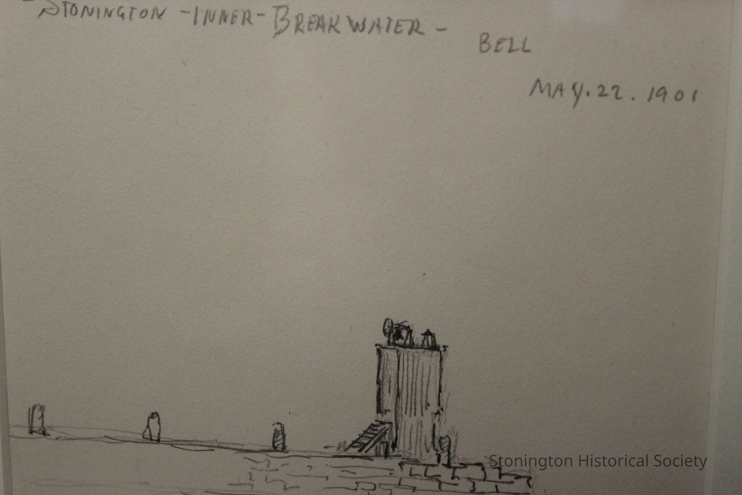 3 Drawings of Stonington Breakwater by Reynolds Beal. Top - "Stonington Light," Tuesday July 18, 1899, 4pm. Bottom Right - "Stonington Breakwater Light fixed Red May 29, 1899." Bottom Left - "Stonington Inner Breakwater Bell May 22, 1901"