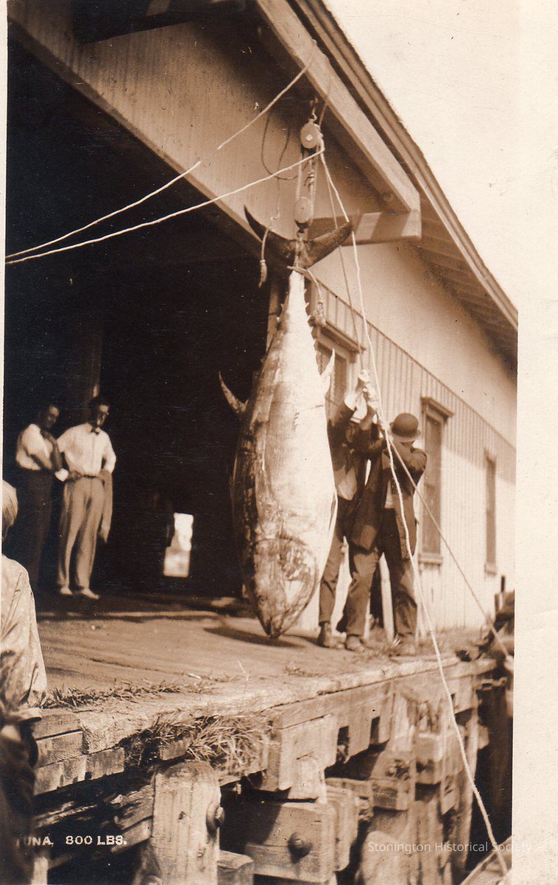 Black and white photograph of an 800 pound tuna brought into Stonington, printed on a postcard.