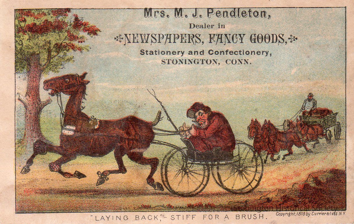Trade Card, "Mrs. M.J. Pendleton, Dealer in Newspapers, Fancy Goods, Stationery and Confectionery, Stonington, Conn." Mrs. M.J. Pendleton had a newsstand at 133 Water Street, Stonington Borough.