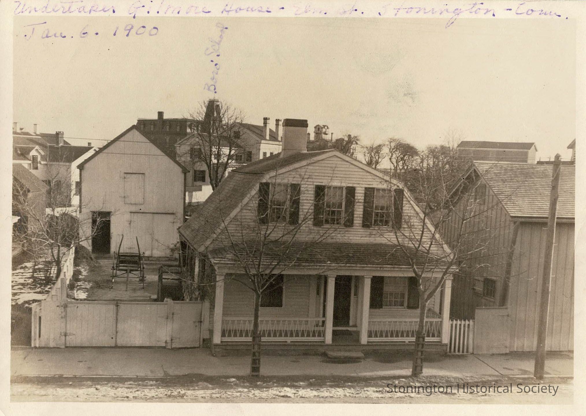Image shows street view of Gilmore House on Elm Street. Carriage is in the yard to the left of the house. The Boro School is noted in the background.