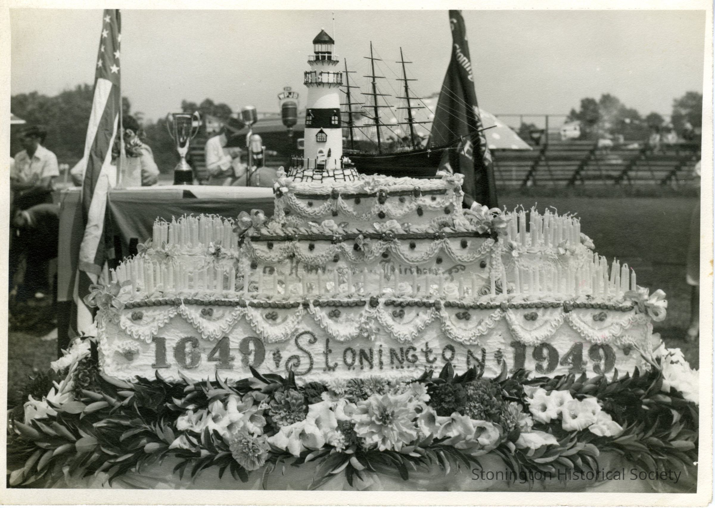Stonington Float - Birthday Cake 1649 1949 for Parade with LIghthouse and ship model on top and candles all around