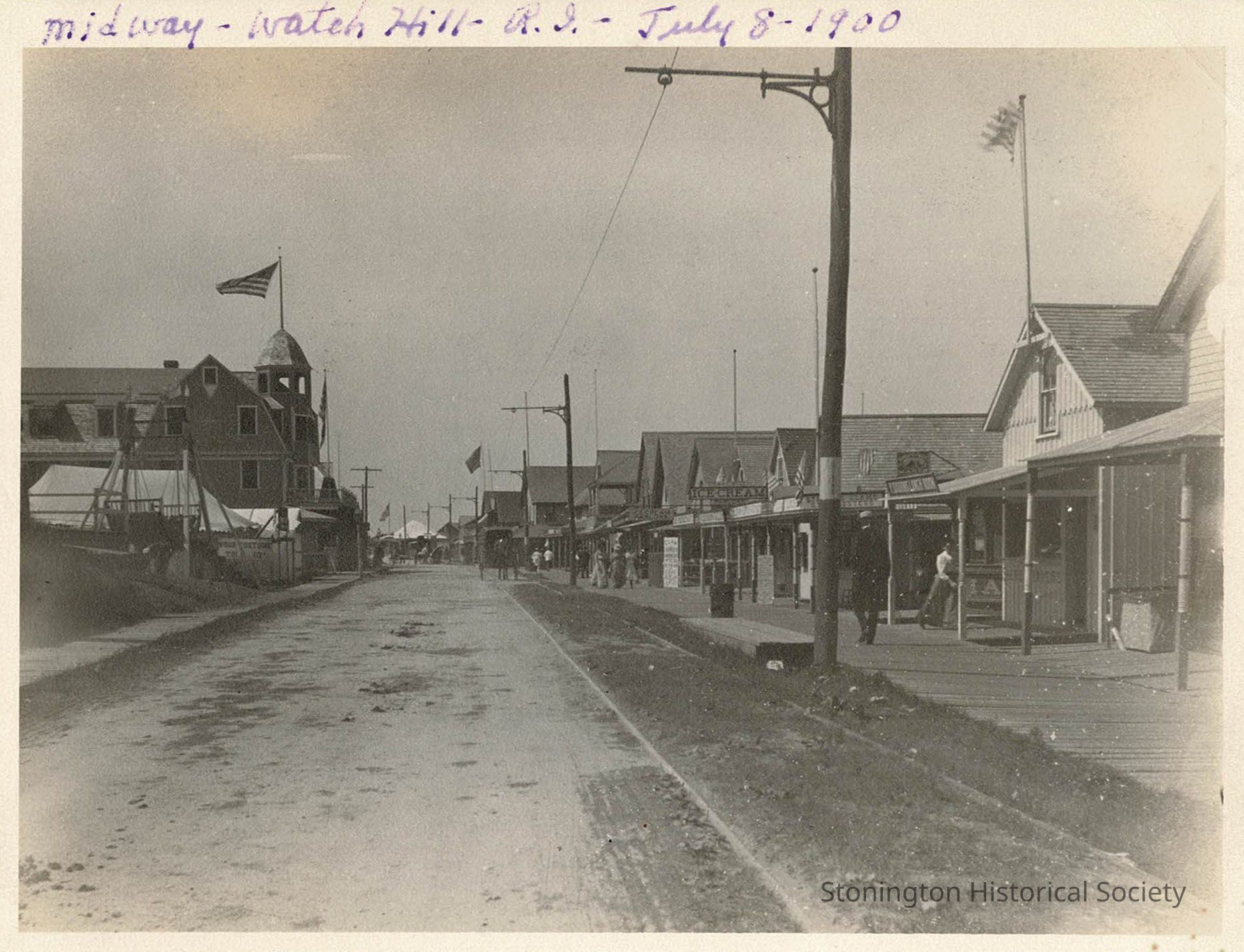 Image shows the main road through Watch Hill before the Hurricane of 1938. There are many shops and restaurants along the right hand side, and what appears to be a park and hotel on the left.Collection