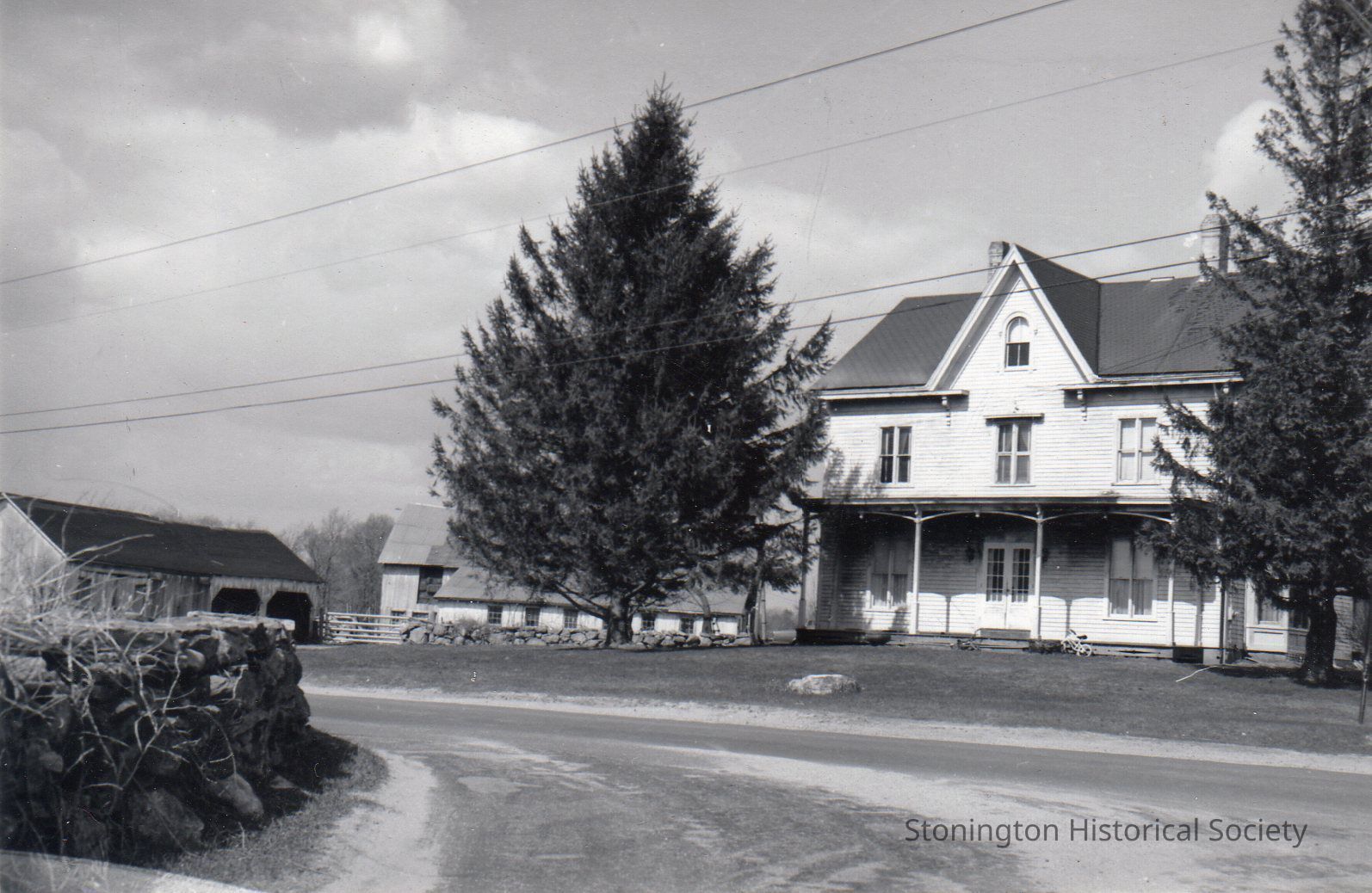 Black and white photograph postcard, the Perkins Farm homestead on Jerry Browne Road at the intersection with Pequotsepos Road (demolished in 2017). Photograph by Maurice LaGrua.Collection