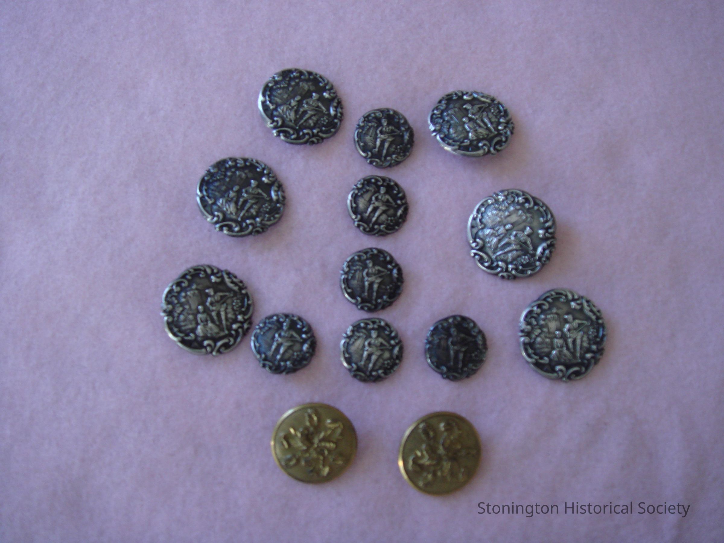 six one inch silver buttons, with raised scene of woman seated in garden and man standinjg with mandolin