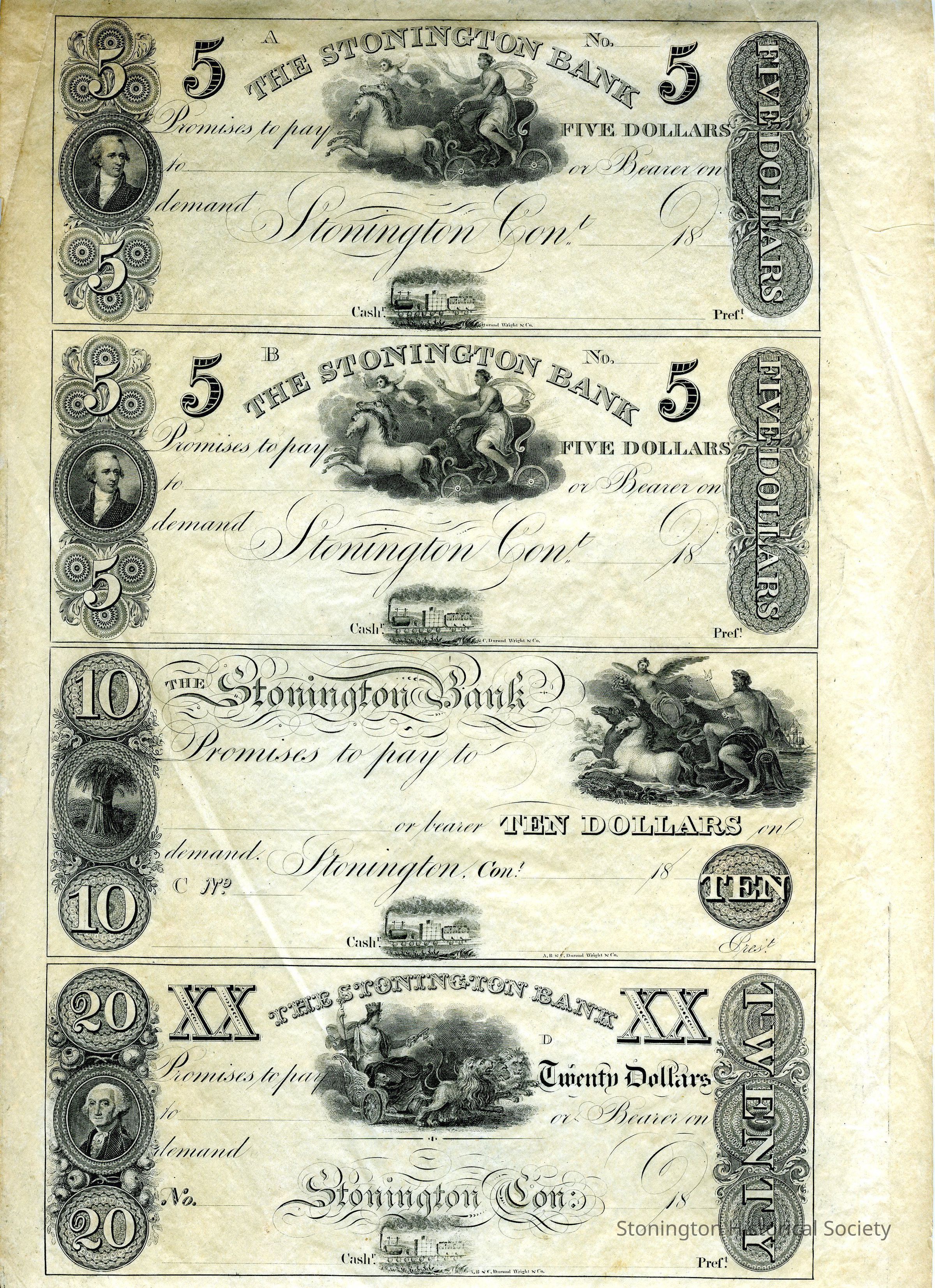 Full sheet of Notes from Stonington Bank ($5, $5, $10, $20)Entry/Object ID