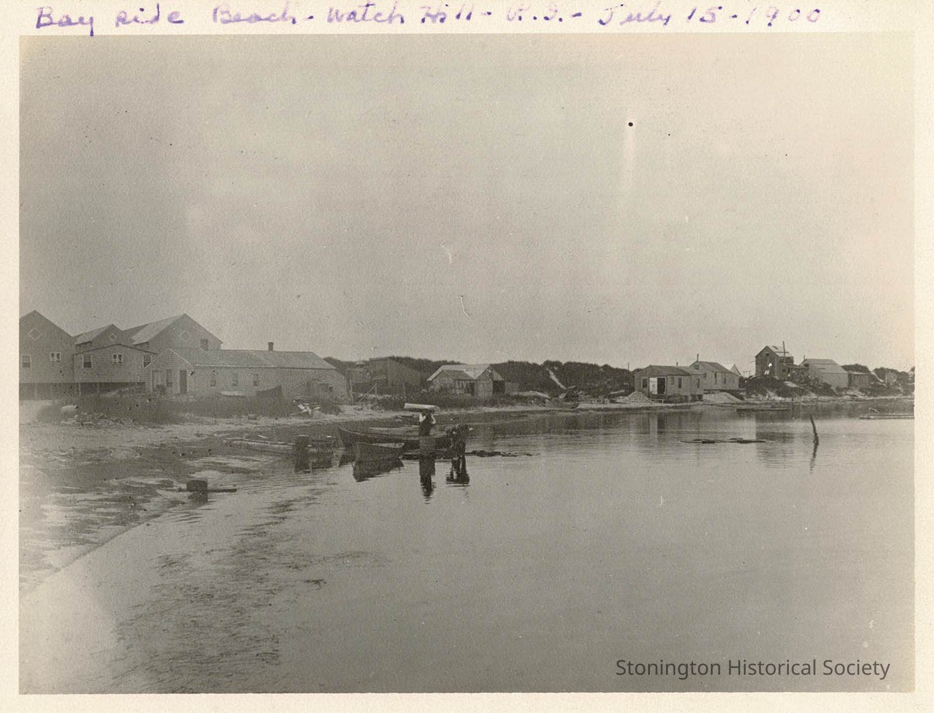 Image shows two fishermen in the shallows near their boat. Buildings along the beach but no other people.Collection