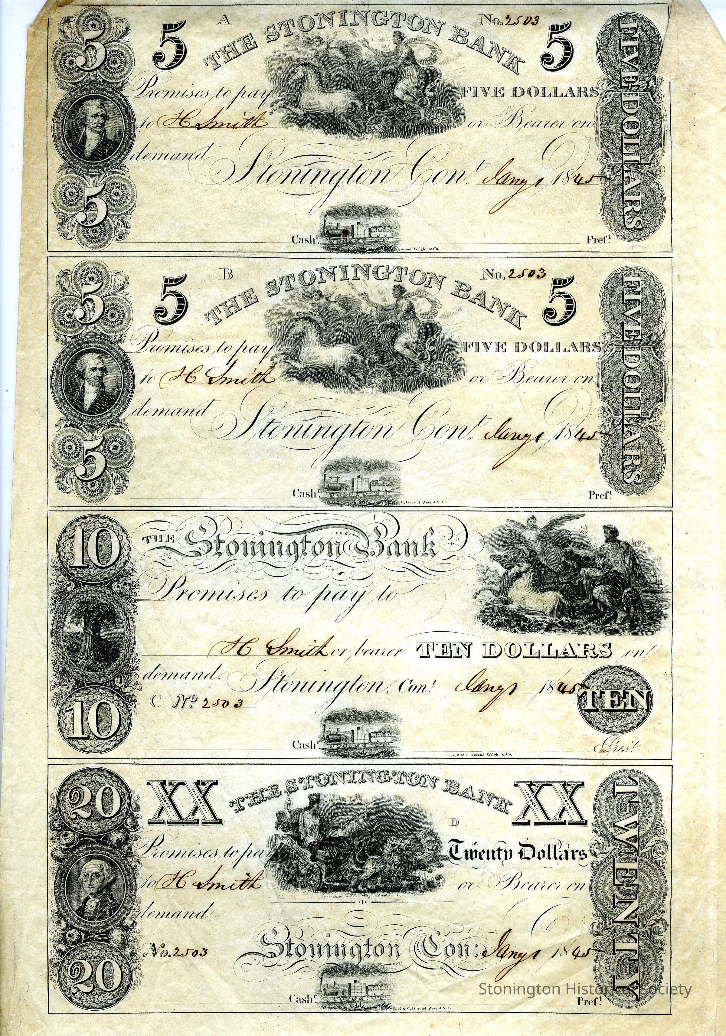 Full bank note sheet from Stonington Bank $5.00, $5.00, $10.00. $20.00Entry/Object ID