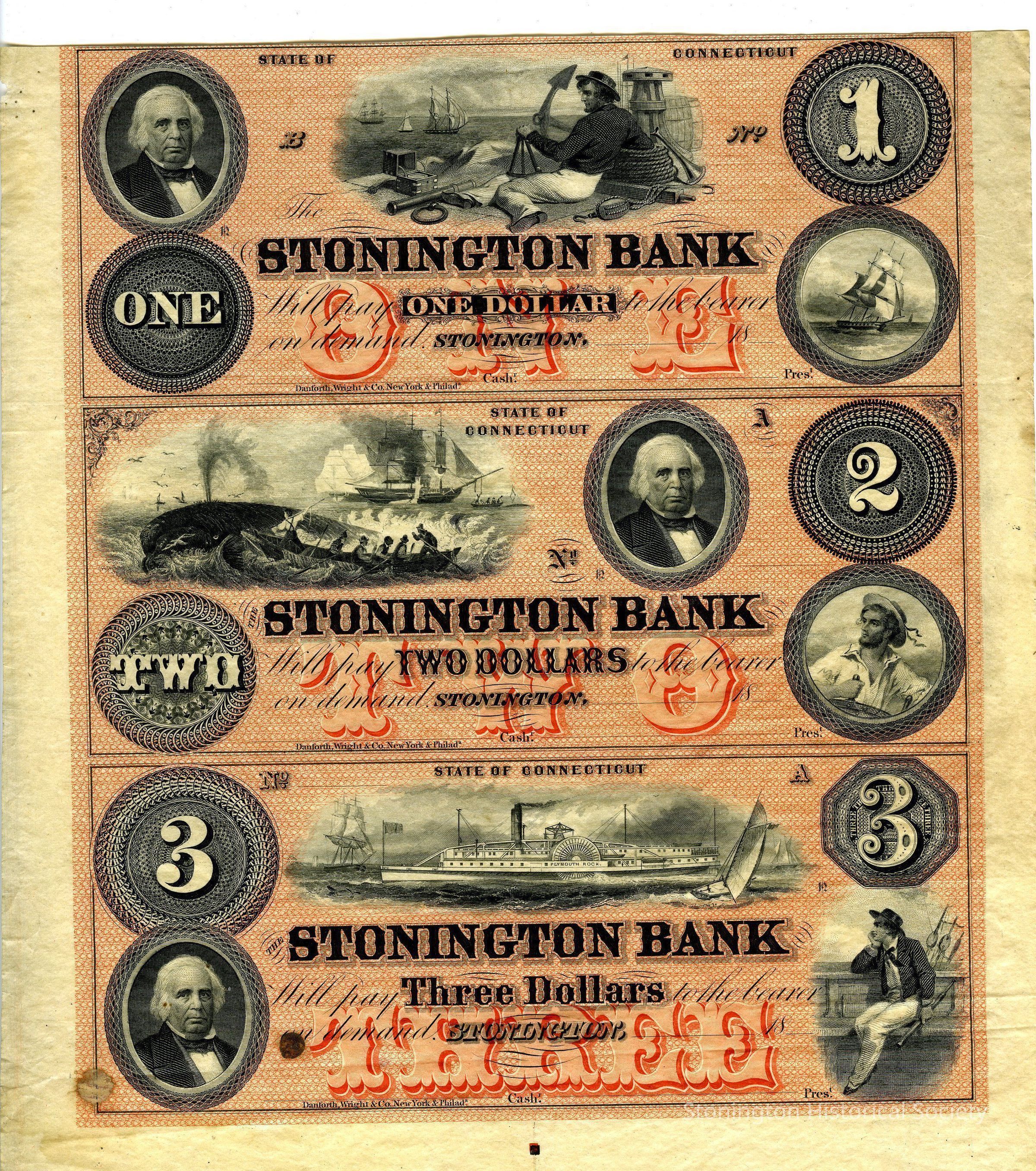 Two (2) partial sheets for bank notes from Stonington Bank. ($1, $2, $3)