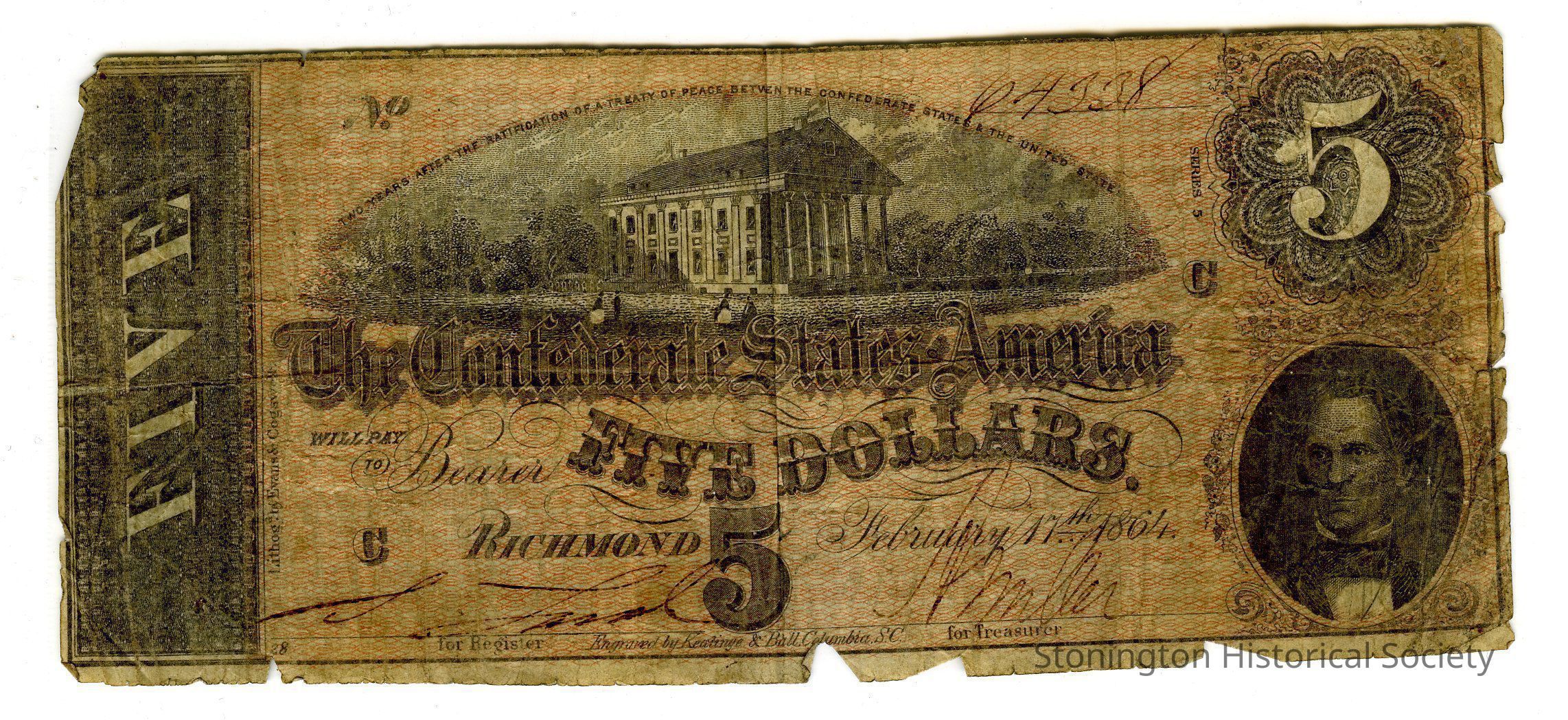 $5.00 Confederate States America No. 64338 Dated Richmond 17, 1864 Engraved & Printed by Keating & Ball, Columbia SC