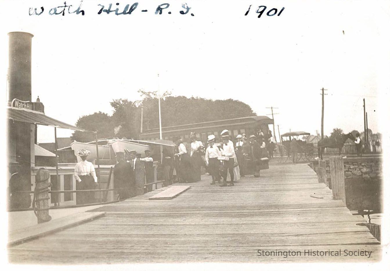 Image shows men and women getting off a trolley and approaching the Watch Hill Tugboat (on the left) from the dock.Collection