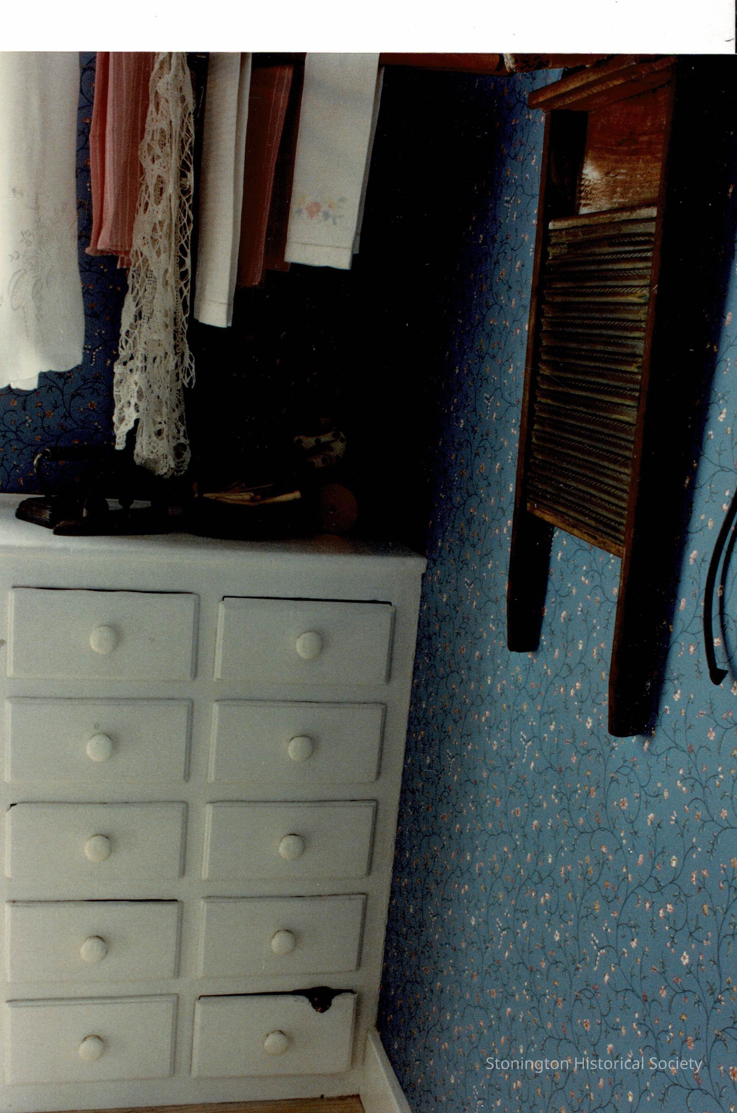 A detail view of the Captain N.B. Palmer house pantry, as it was decorated for the Designer's Show House in 1989. The blue wallpaper is still there, as of 2024.Collection