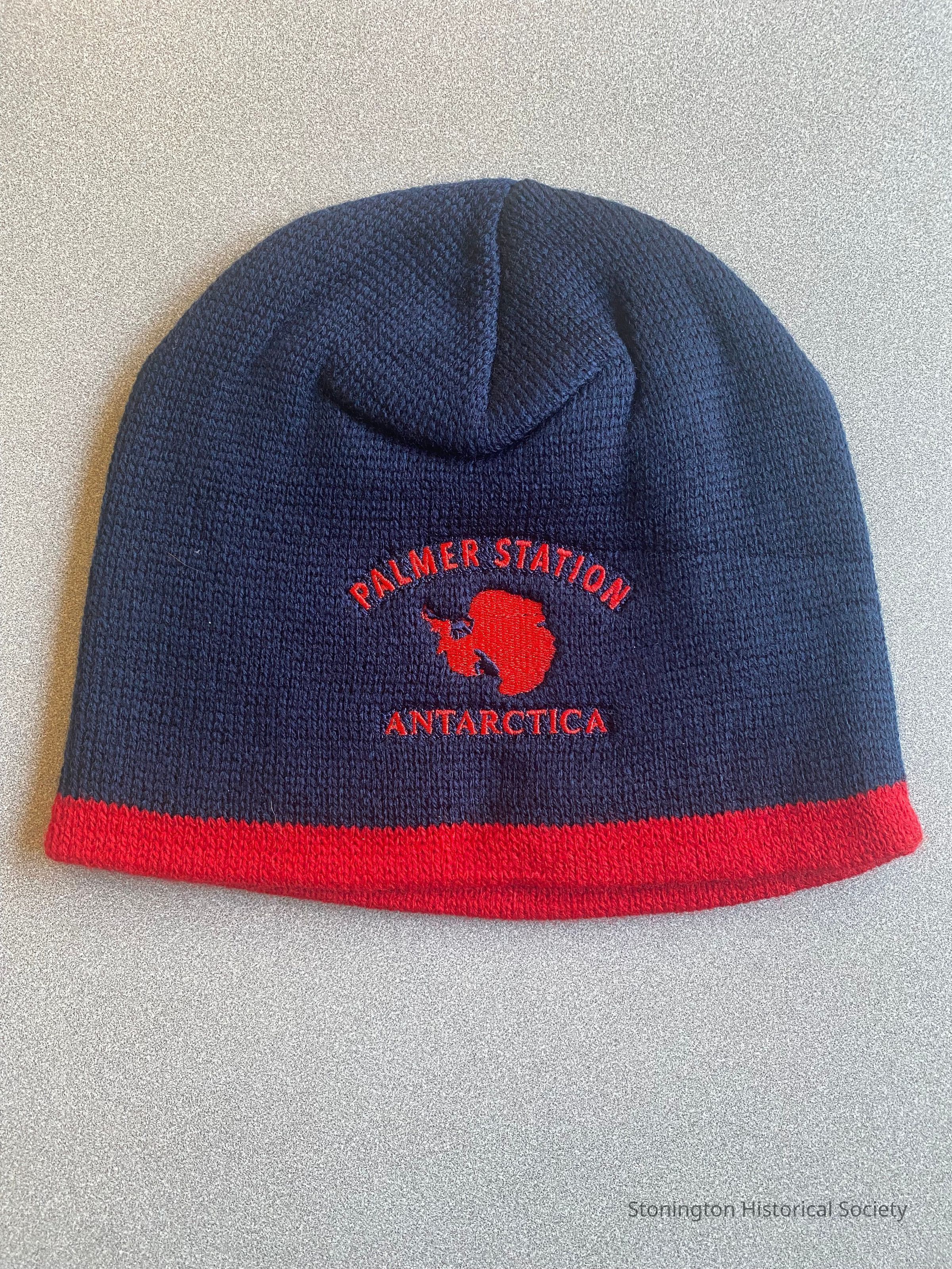 Navy blue and red jacquard knit beanie, embroidered with Palmer Station, Antarctica. Made by Cap America in the USA. Brought back from Antarctica by Glen Gordinier in 2020.Collection