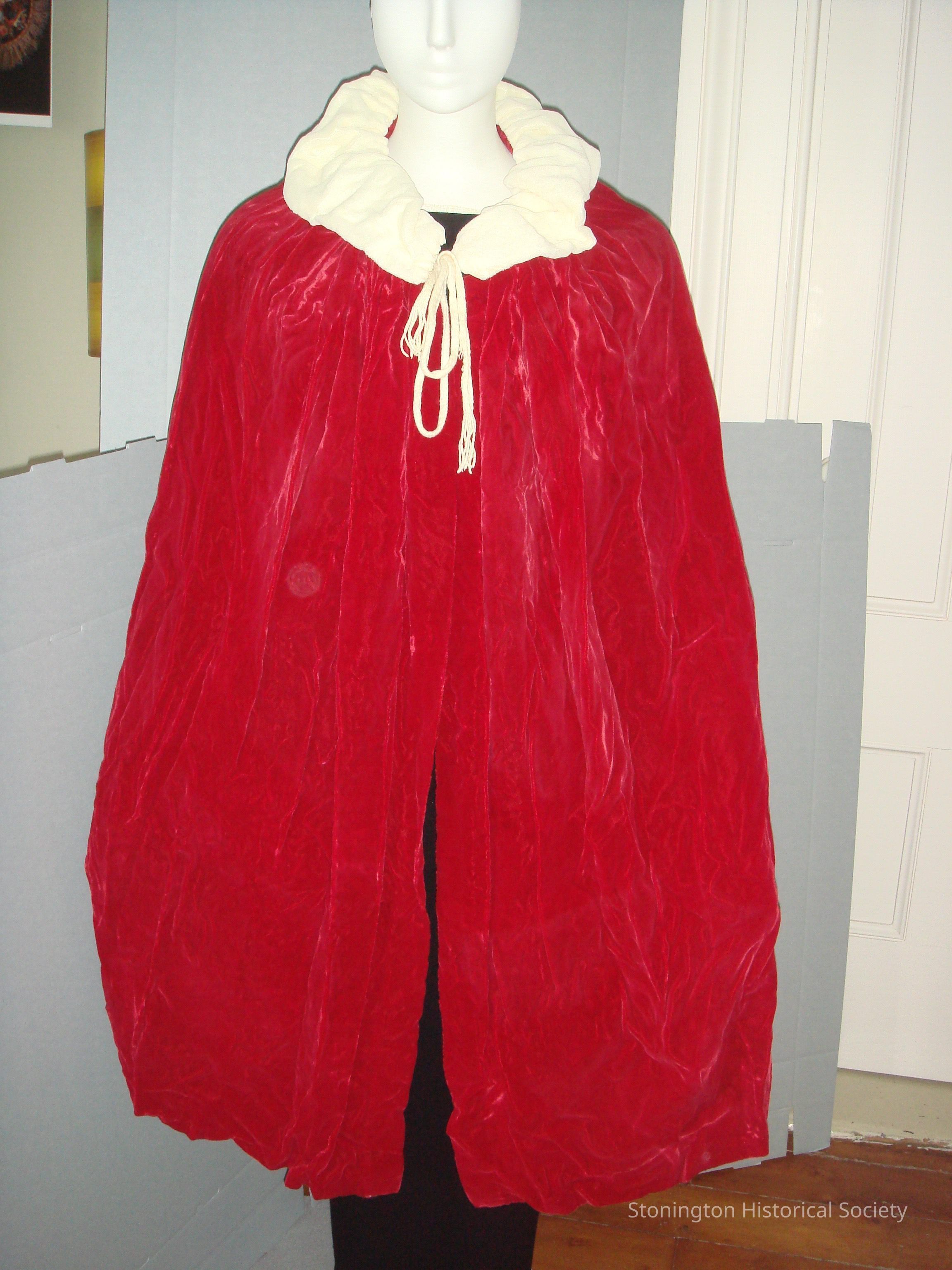 Red Velvet Cape roughly handsewn with white 5 inch collar gathered at neck edge neck edge gathered with white cotton cording