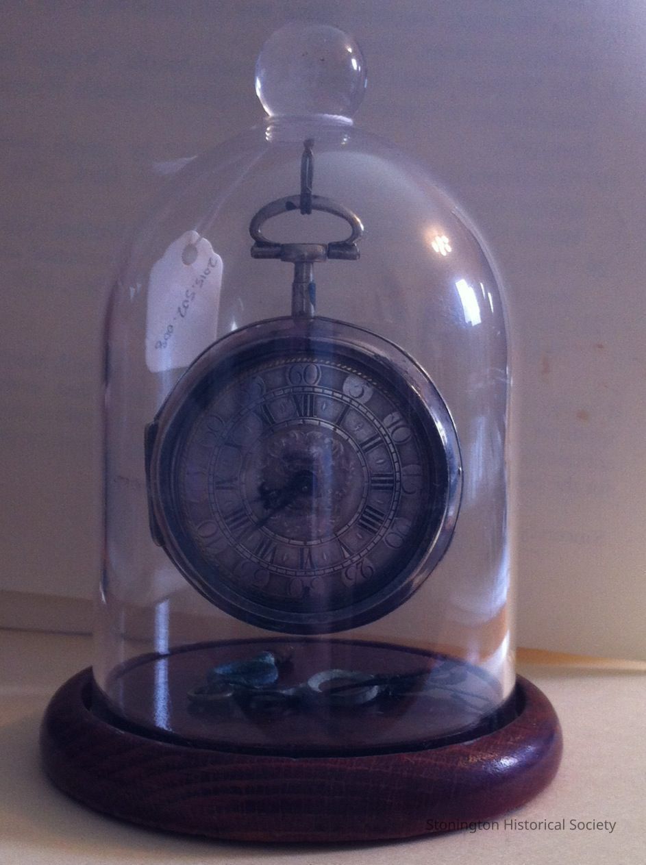 pocket watch with two winding keys, inscribed: "James Paffard, Portsmouth, 1760," hanging under a glass dome, made by "Foster, London"