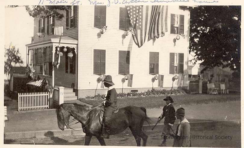 11 Main Street, house of Mrs. James Van Allen Trumbull showing parade for Battle of Stonington Celebration, 1914