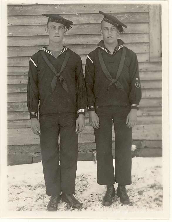 The Marshand boys in uniforms, Willie on left, Jack on right; standing outside of building in snow.
