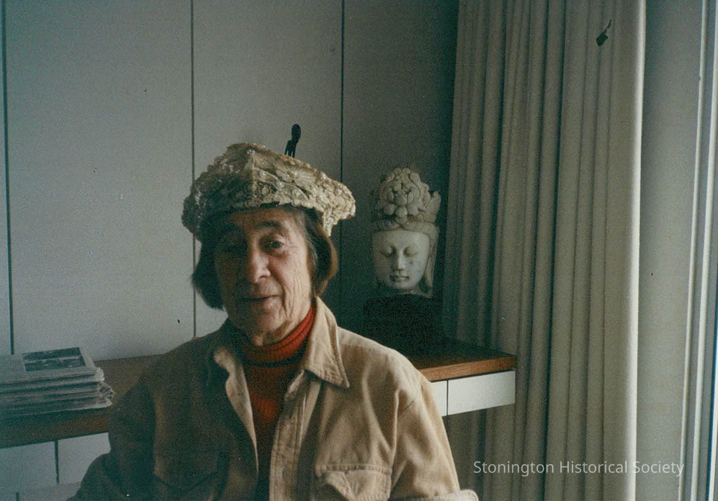 Color photograph of Rollie McKenna in lace cap with Buddha statue behind her.