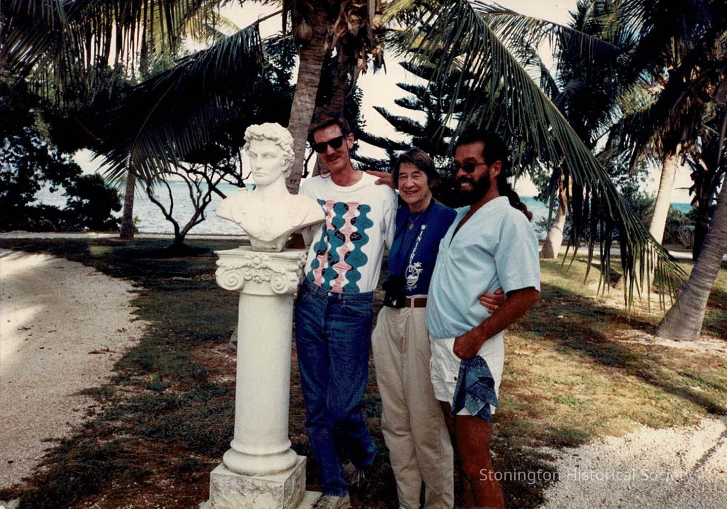 Color photograph of Rollie and two unidentified men. They are standing near a statue in Florida. The taller man in the pink and green shirt may be married to one of Pat's daughters.Collection