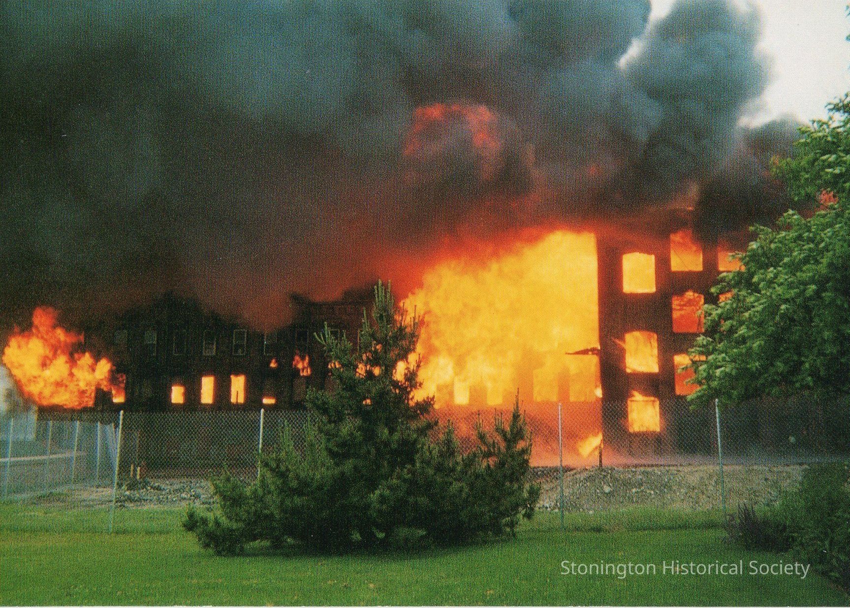Collection of 3 color photograph postcards of the fire at the Monsanto/Atwood building on Water Street in Stonington Borough, July 3, 2003, by Bernie Gordon.