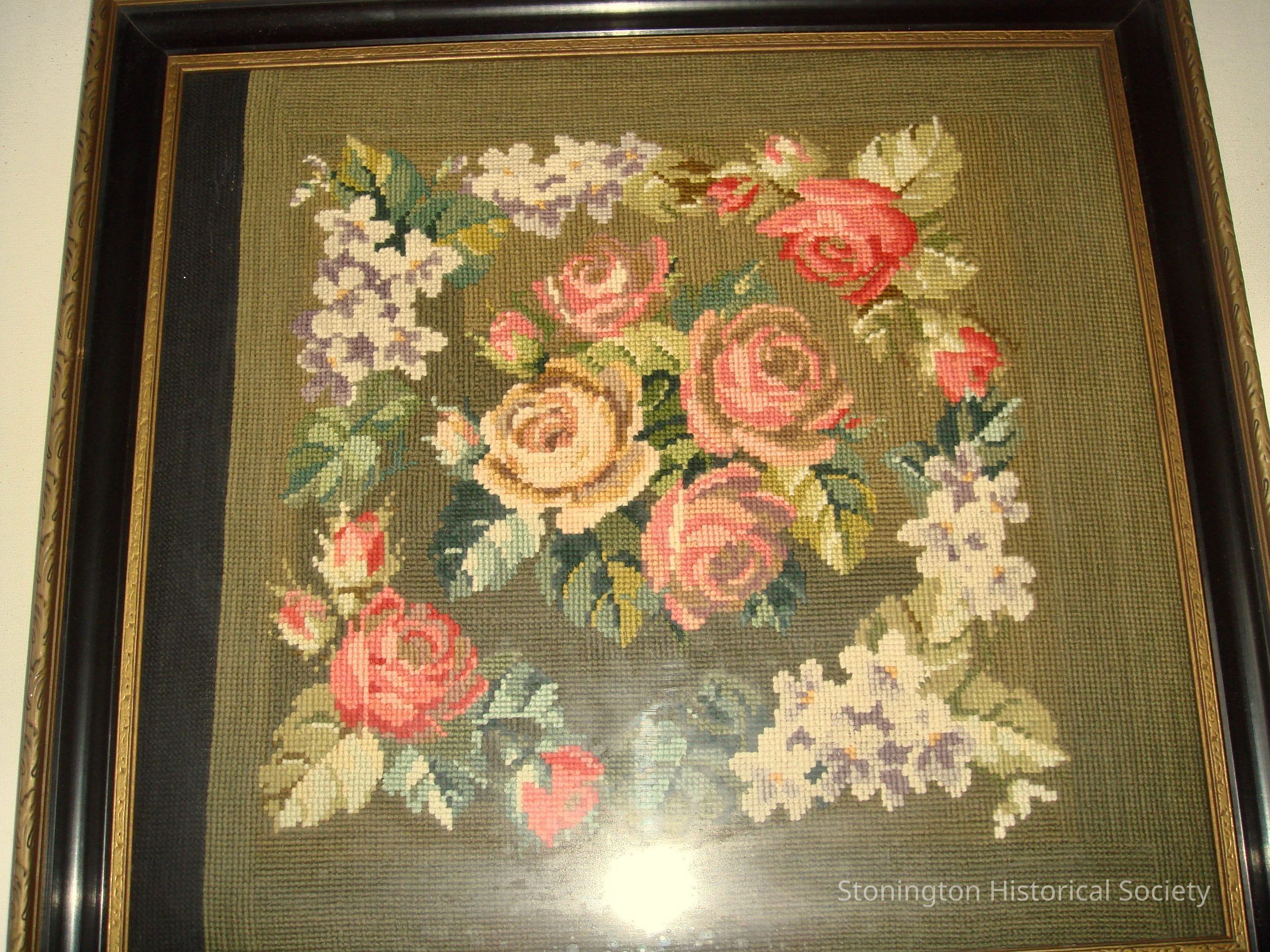 Needlepoint framed behind glass green background with central cluster of roses surrounded by square wreath of roses and pansies