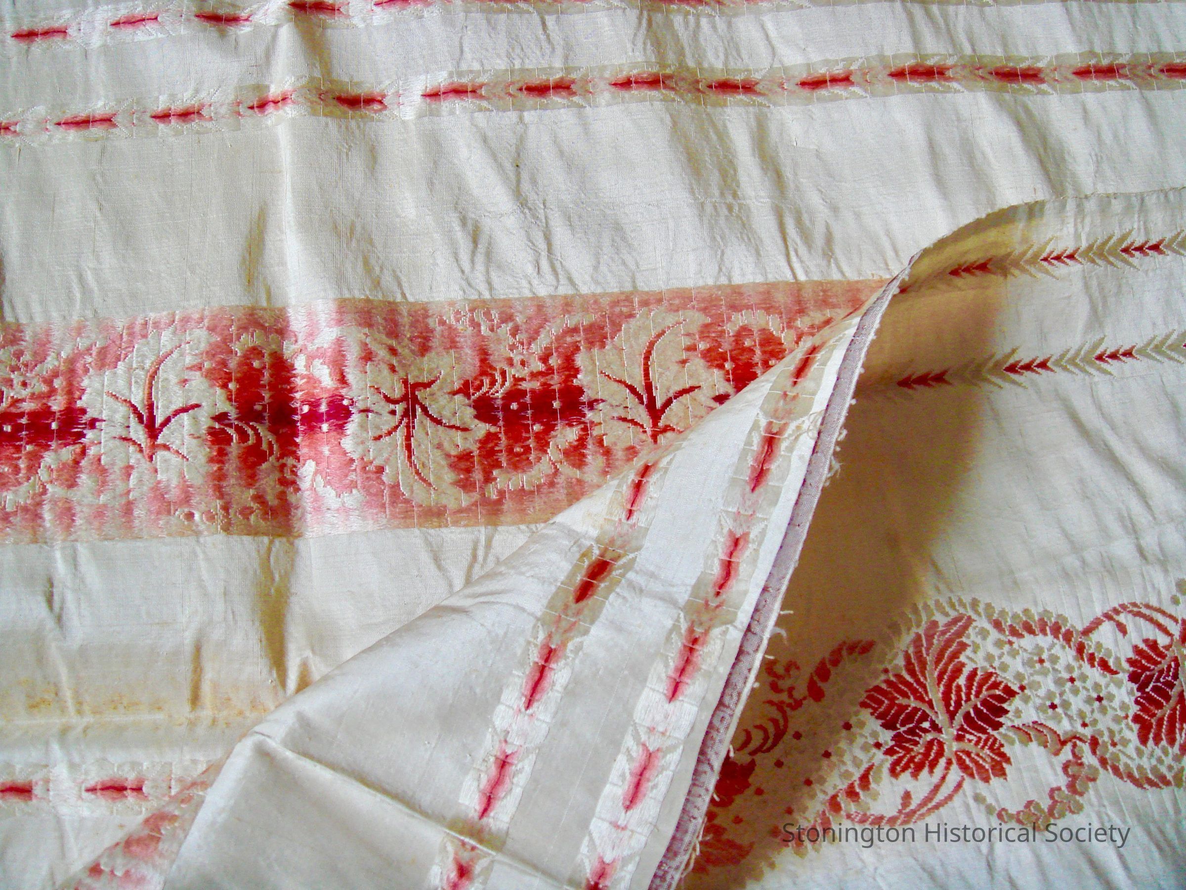 Cream color with vertical trellis of peach and rose colored leaves and narrow