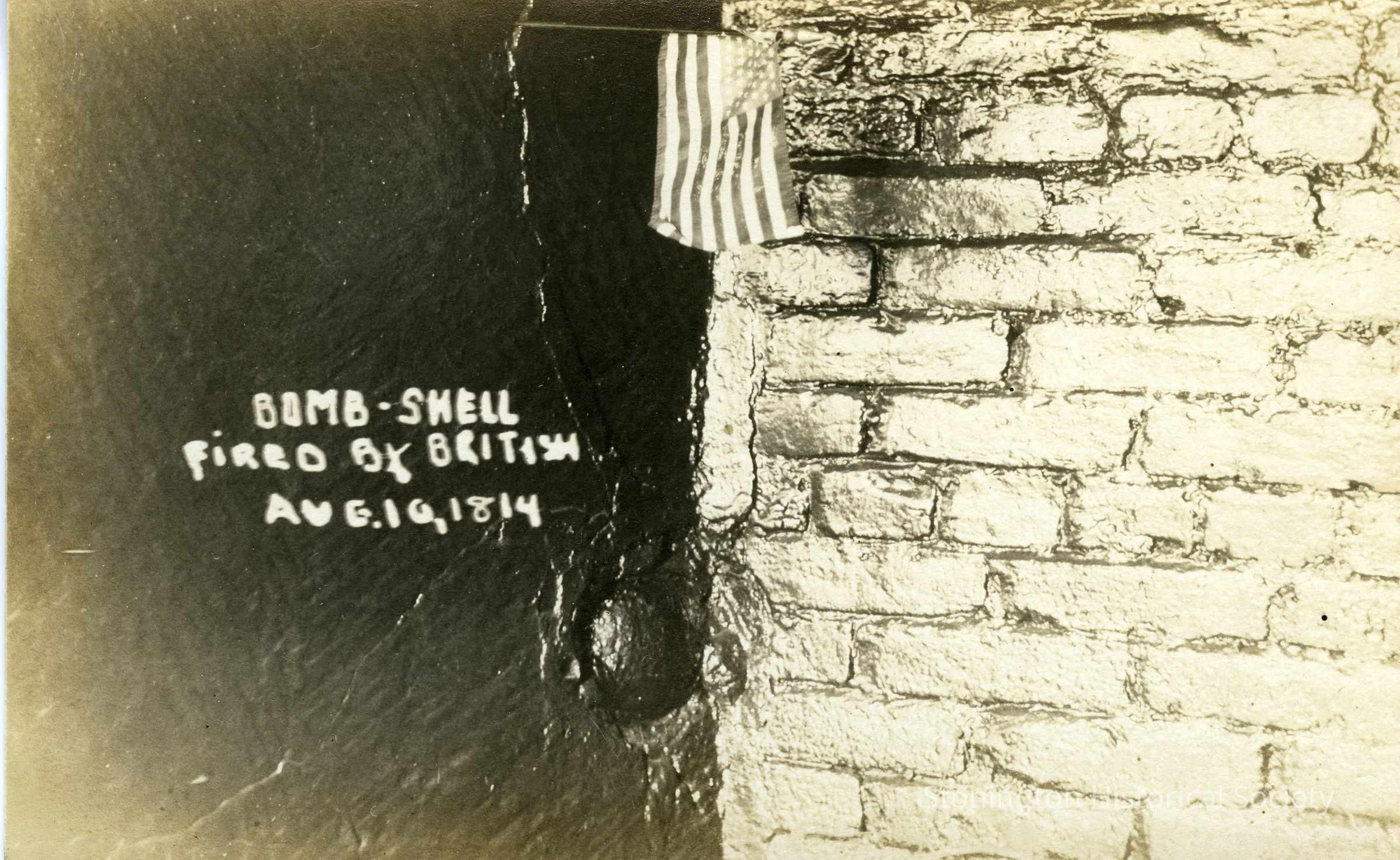 Bomb Shell fired by British in Wall with brick wall on right and flag above