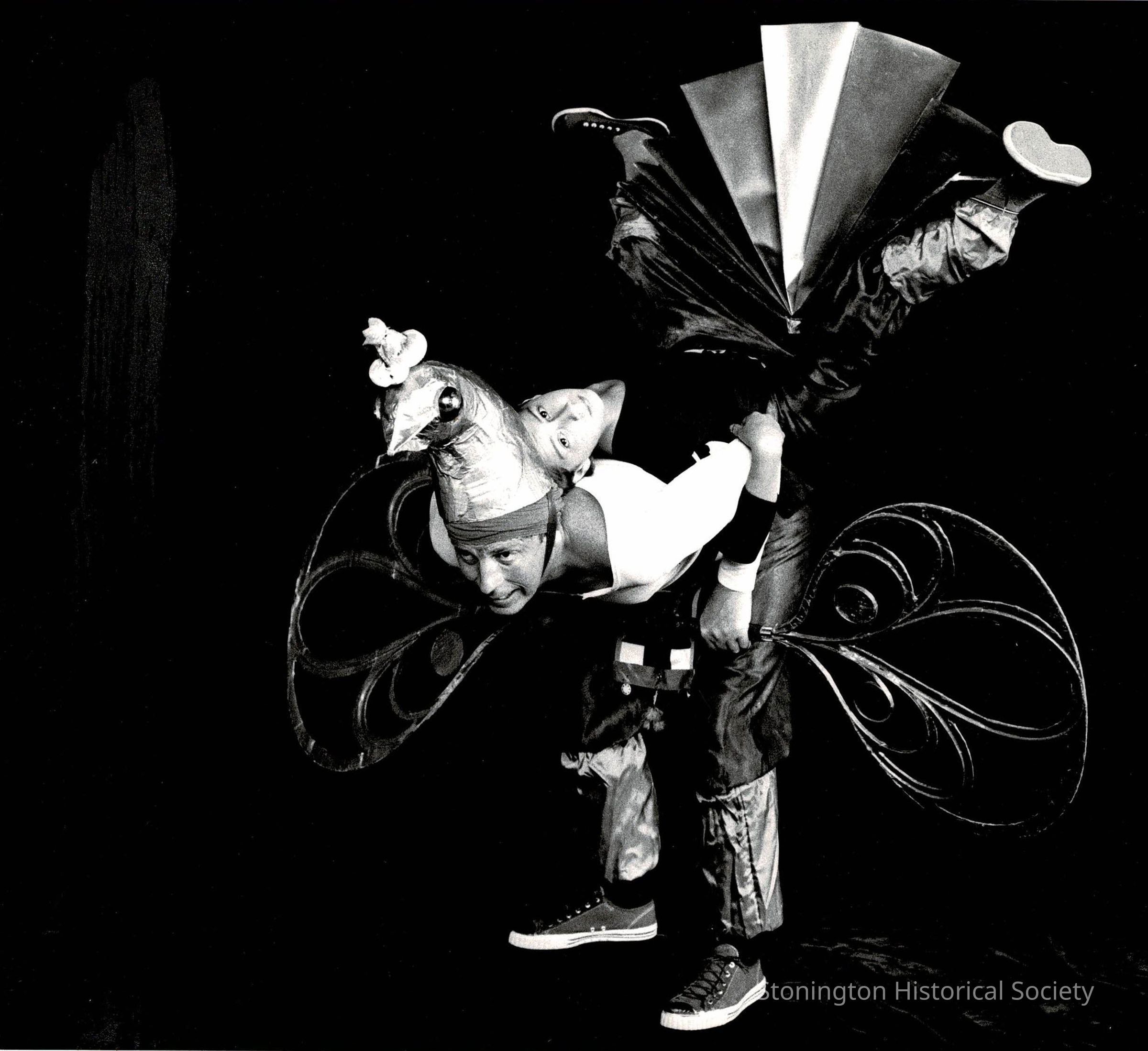 Photograph of large bird created by two actors. Could be Dan Potter and one of his daughters.