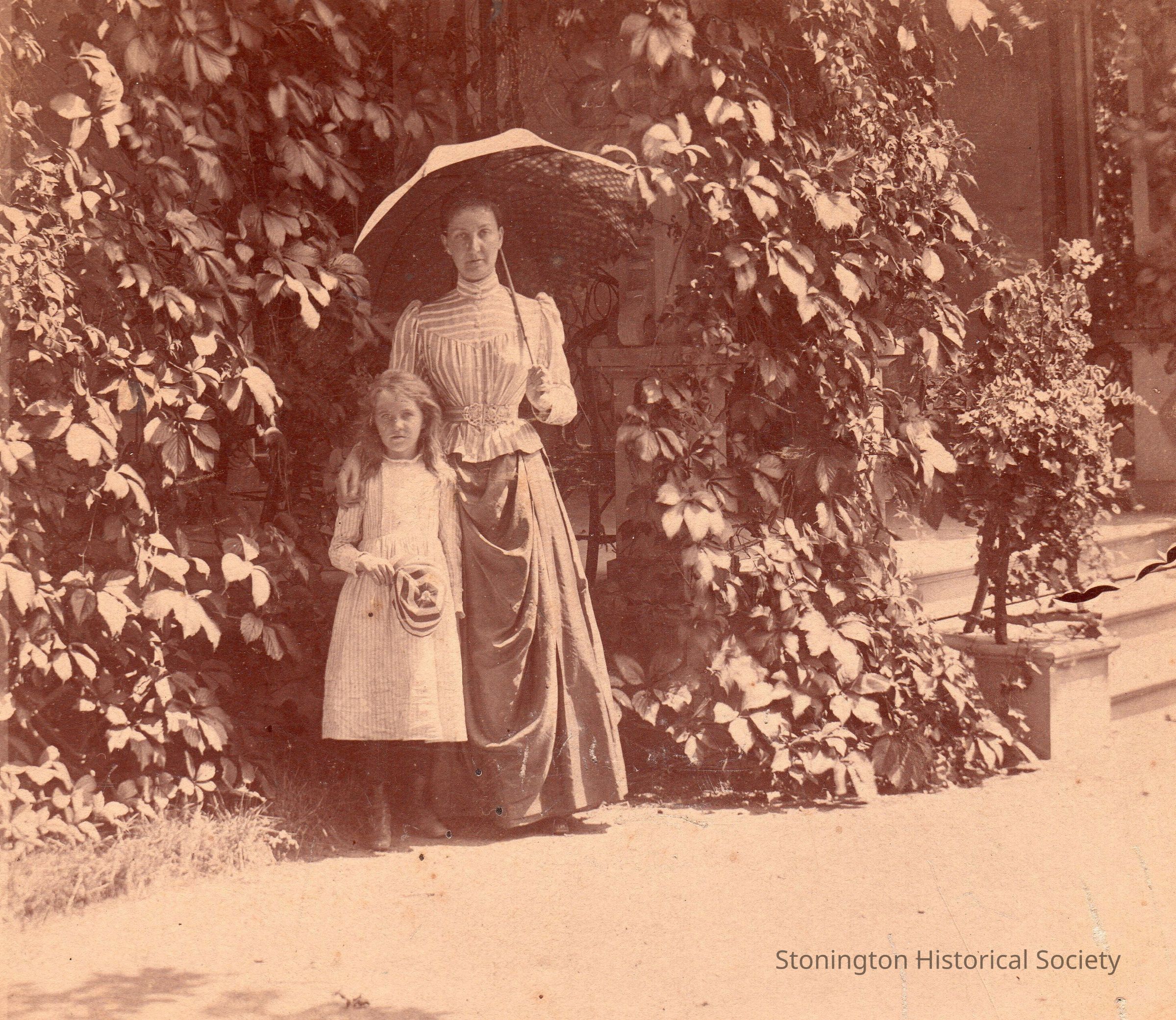 Sepia photograph of women in the Trumbull family at the Culbert Palmer house (originally the Horace Niles House) at 85 Main Street off Wadawanuck Square, August 1891. Handwritten on back: "by Miss Lulu Trumbull"