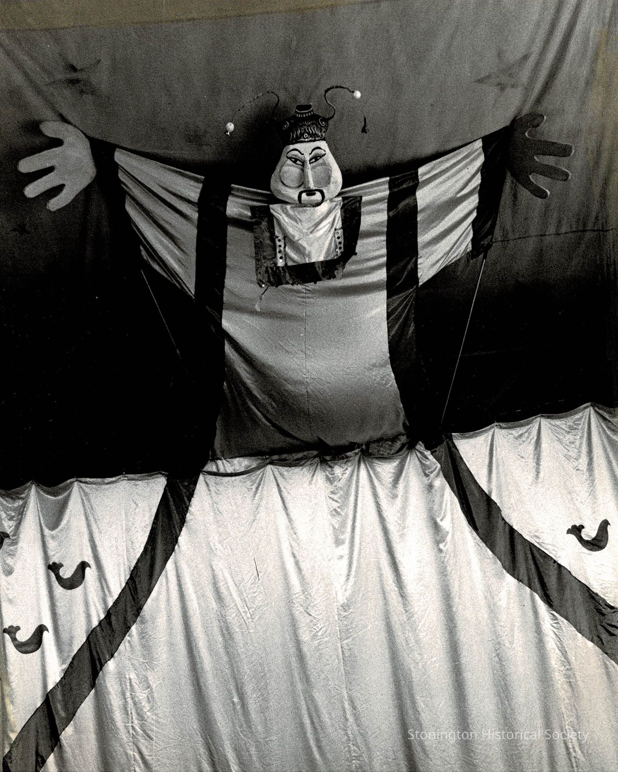 Emperor puppet above the backdrop with his arms outstretched. These photographs were taken to be part of a children's book that was never completed.