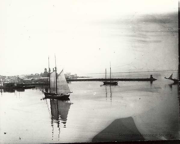 1828-1830 breakwater with tower of Trumbull factory in background. Saling vessels