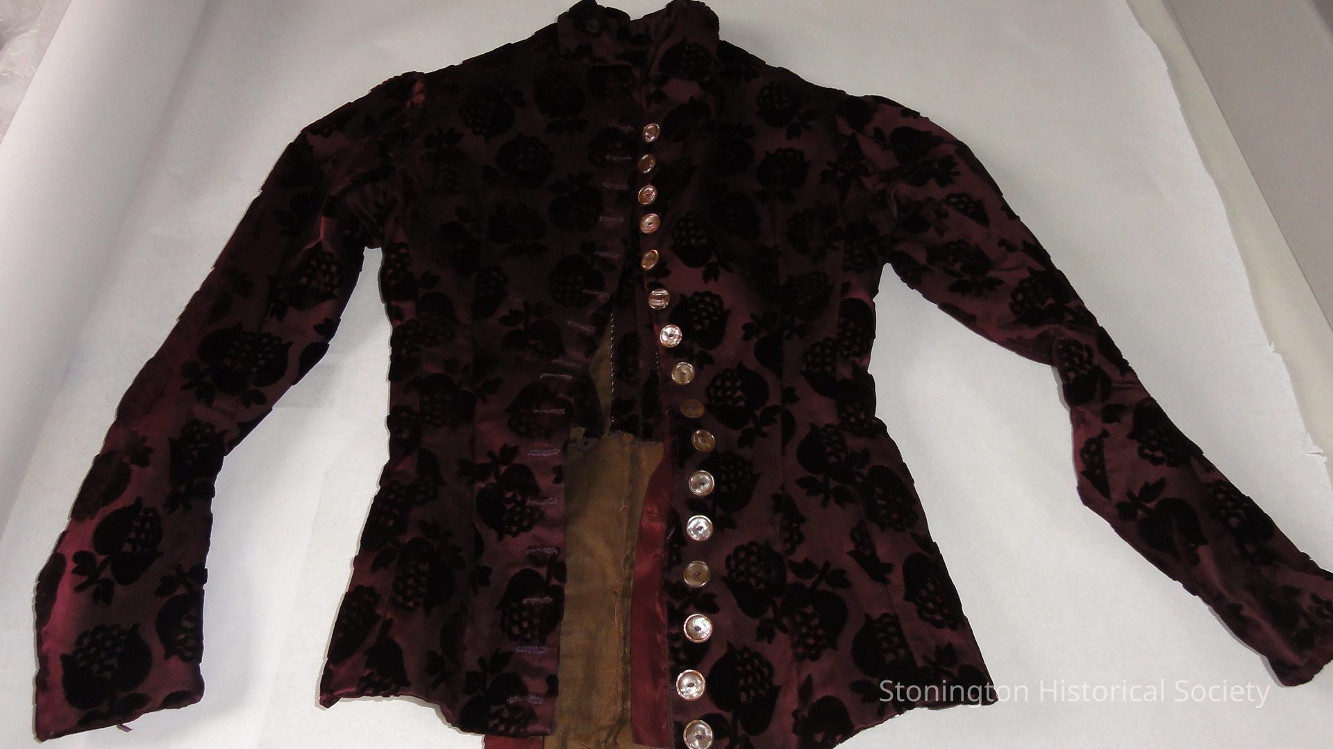 sewn to inside front seams are 4 1/2 by 2 1/2 pieces of lining with 6 brass hooks and eyesCollection