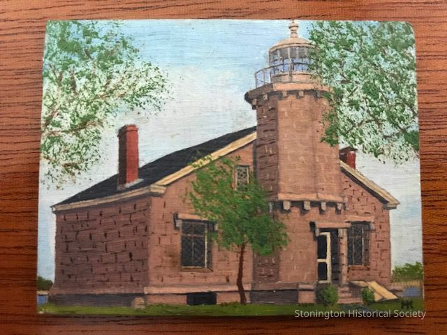 Approximately 2.5 x 2 inch painting of the Stonington Lighthouse Museum from the western lawn. No surrounding buildings are visible.