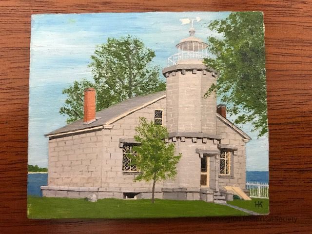 Miniature painting of the Stonington Lighthouse Museum from the western lawn. Approximately 2.5 x 2 inches. Water is visible in the background, but no surrounding buildings are pictured.Collection