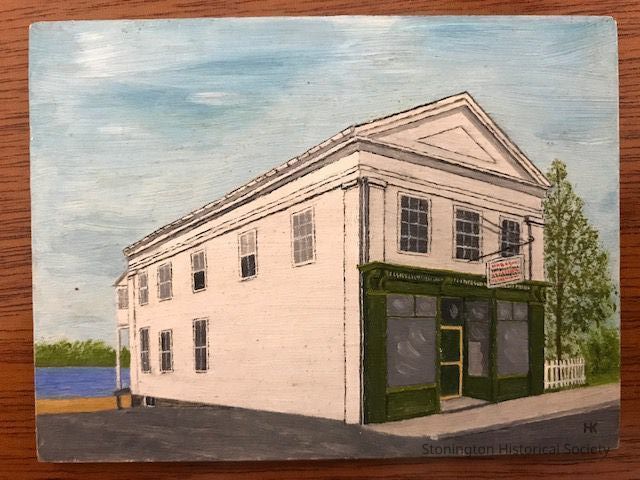 Miniature painting of the Union Hardware Store in Stonington Borough. Painting measures approximately 4 x 3 inches.
