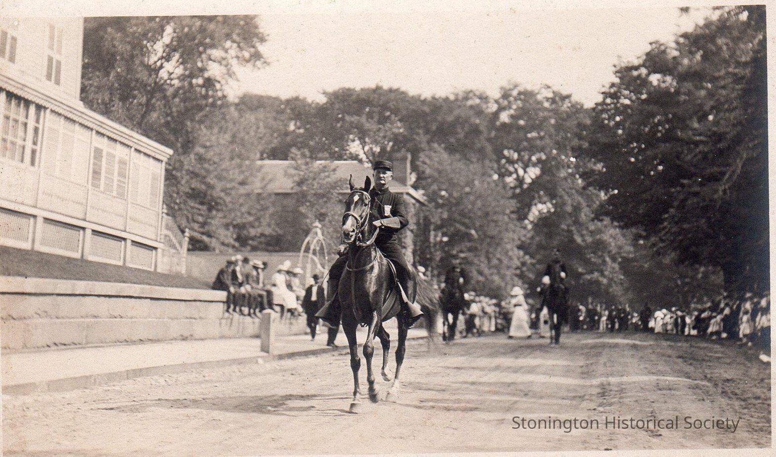 Postcard, black and white photograph of the Battle of Stonington Centennial Parade in Stonington Borough, August 1914. Hadlai A. Hull, parade marshall.