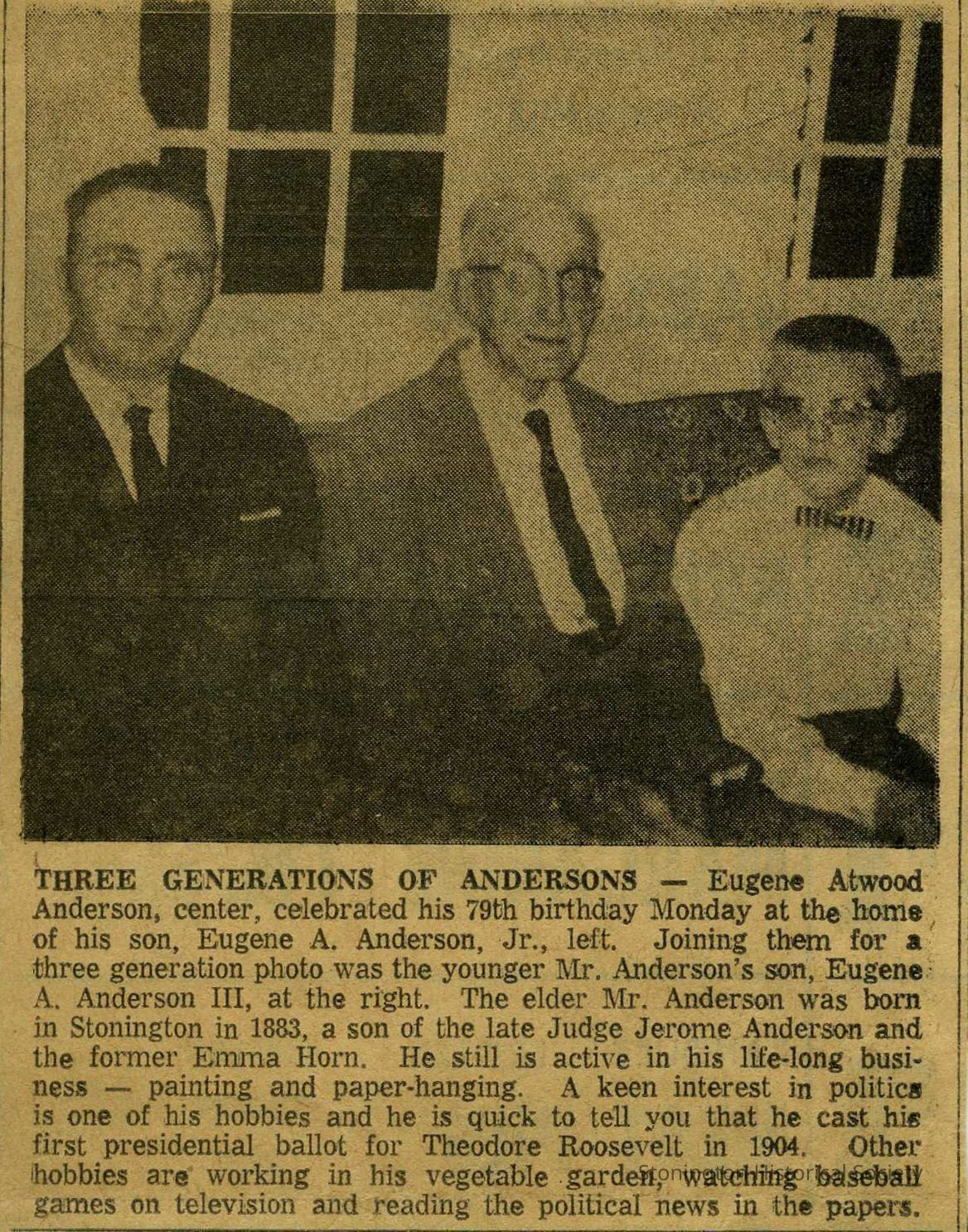 Newspaper clipping of a photograph labeled "Three Generations of Andersons." It shows Eugene Atwood Anderson celebrating his 79th birthday with his son, Eugene A. Anderson Jr. and his grandson, Eugene A. Anderson III.Collection