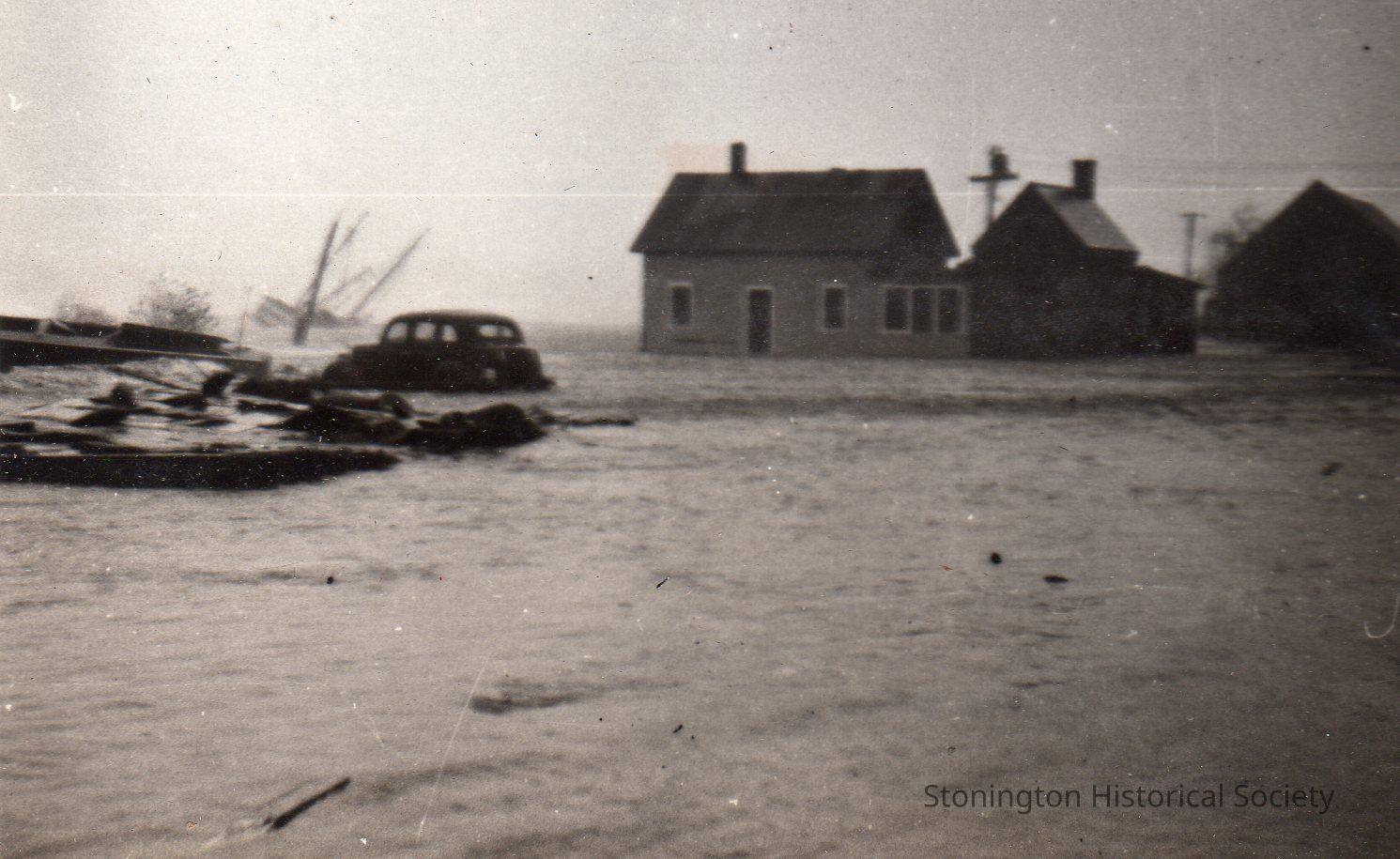 Black and white photograph of flooding at the shipyard on Northwest Street during the 1938 Hurricane. From photograph album of Bertha D'Amico.