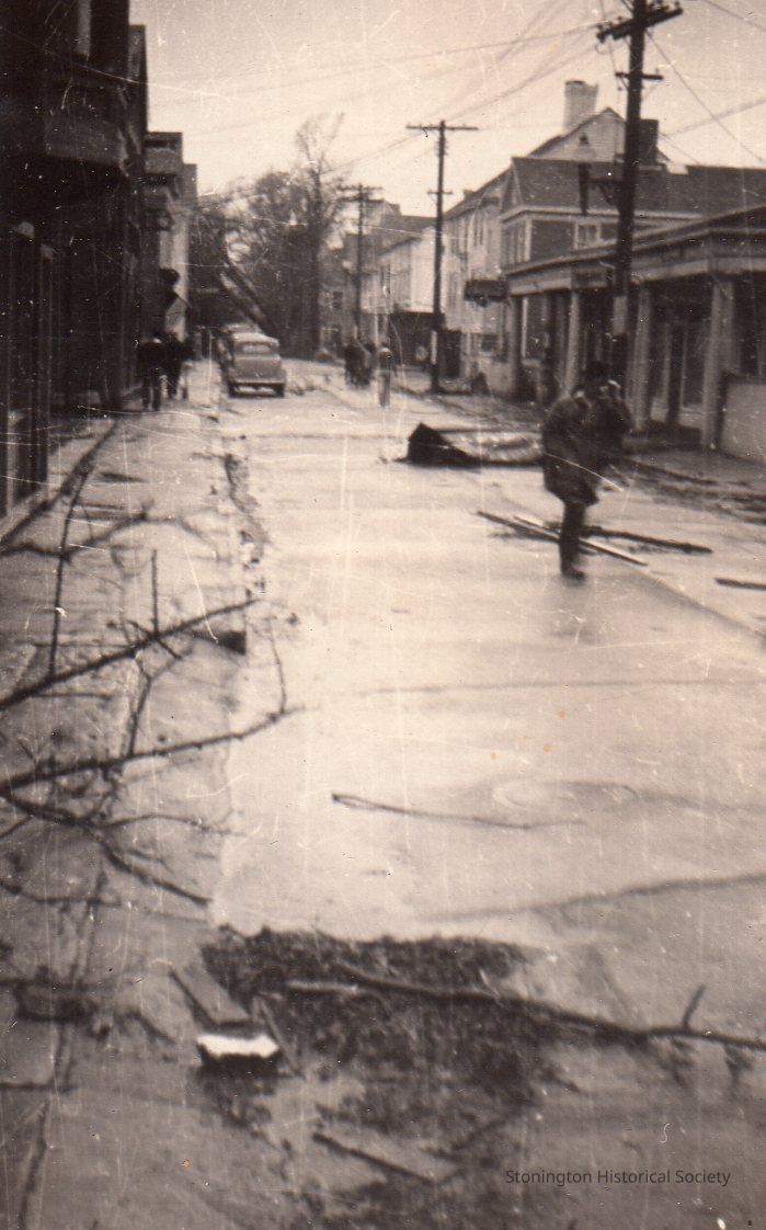 Black and white photograph of damage on Water Street from the 1938 Hurricane. From photograph album of Bertha D'Amico.