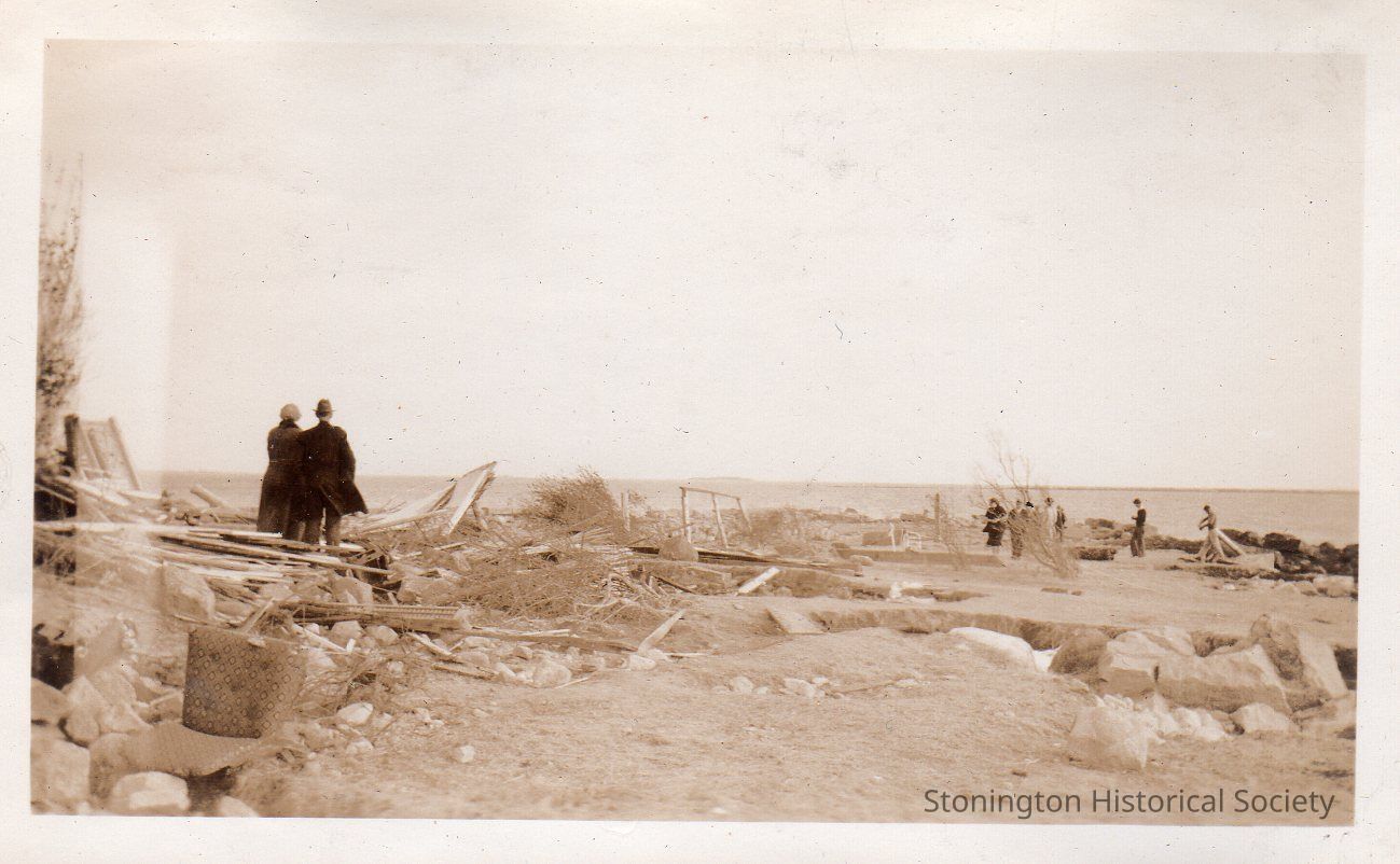Black and white photograph, view of damage from the 1938 Hurricane at Stonington Point. From photograph album of Bertha D'Amico.