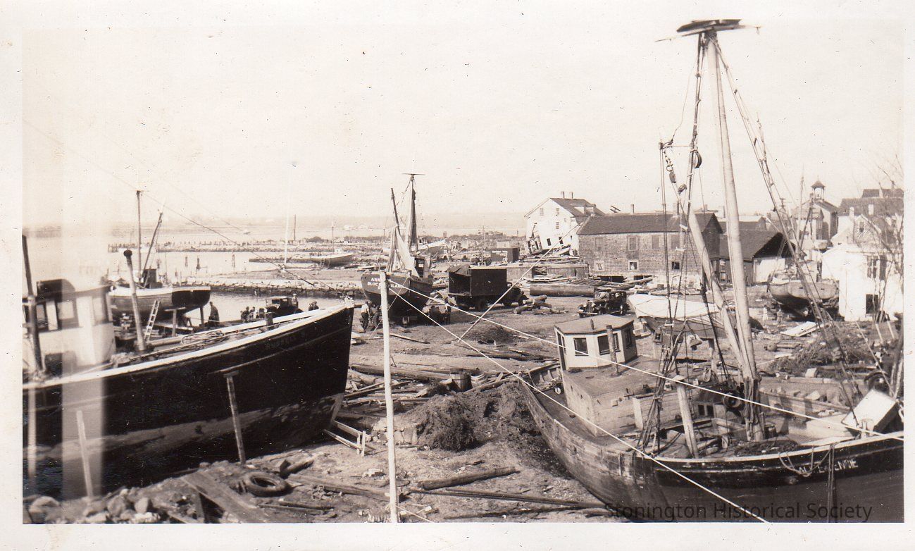 Black and white photograph, the fishing boats washed up along Water Street following the 1938 Hurricane, view from the upper porch of 92 Water Street. From photograph album of Bertha D'Amico.