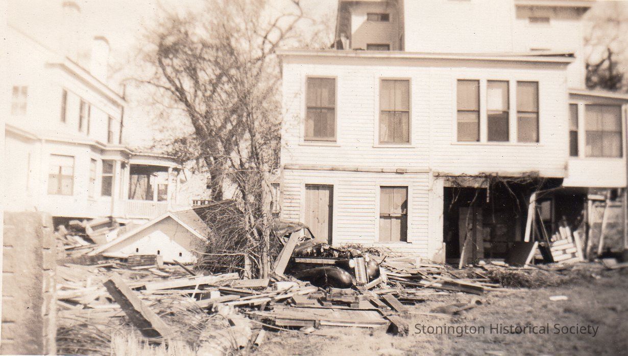 Black and white photograph of damage to "Miss Anderson's Home" on Water Street following the 1938 Hurricane. From photograph album of Bertha D'Amico.
