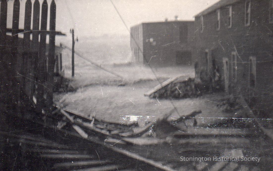 Black and white photograph of flooding in the Atwood Machine Co. yard during the 1938 Hurricane. From photograph album of Bertha D'Amico.