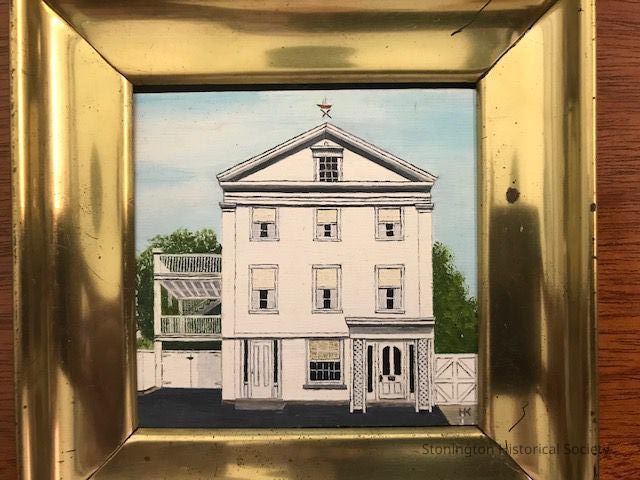 Miniature framed painting of 22 Pearl Street in Stonington Borough. The house is viewed from the front with no surrounding buildings pictured. A small weathervane of a red boat is visible at the top of the house. Painting measures approximately 3.25 x 3 inches.Collection