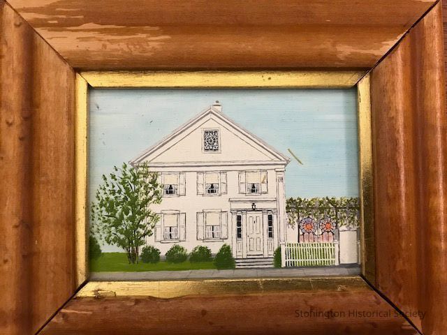Small framed painting of the house at 70 Main Street in Stonington Borough. The home is painted from the front with stained glass windows visible on the ell to the right. No other buildings are pictured. Painting measures approximately 4 x 3 inches.Collection