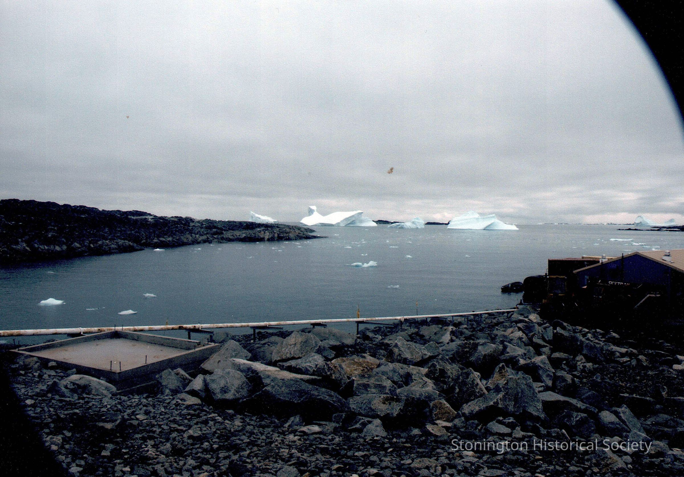 Photograph taken by Richard J. Scheffler on Anvers Island, Antarctica (Palmer Station) in February of 2003. Mr. Scheffler was on a Lindblad Expeditions trip on the vessel Endeavour. Photographs were taken with a Minolta Dimage 7Hi digital camera. This photograph depicts a view towards the water from the high ground near the oil tank.Collection