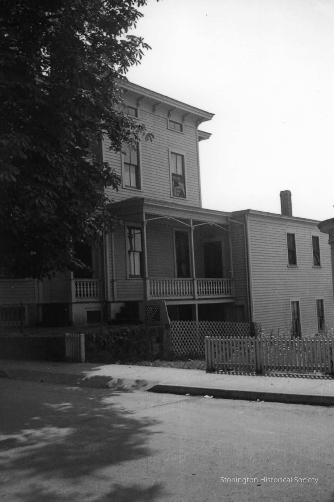 Side view of the Anderson home at 98 Water Street taken from the road. It shows a side porch and the fence along the road. There are two copies of this print and the negative is included behind the photographs.Collection